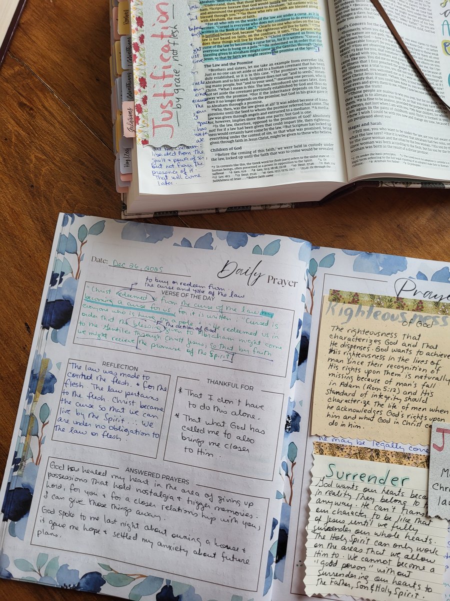 I always start by spreading everything out on the kitchen table. I’ve found having my supplies ready helps me actually sit down and spend intentional time with God—no searching for pens or sticky notes when I’m already in that prayerful headspace.